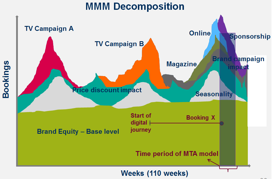 Figure 1 depicts MMM decomposition of the main drivers of the modelled time series of bookings. MTA modelling is generally done on a subset of conversions included in MMM but it models them in a highly disaggregated manner. In MMM, an incremental booking made in a certain period will be potentially attributed to the campaigns that took place in the same period or several periods before the booking. MMM quantifies advertising contribution through aggregating incremental sales that took place on top of the base level MTA measures the contribution of all touchpoints and campaigns a customer was (or might have been) exposed to on their purchase journey. The value of each touchpoint will be quantified by MTA algorithm.