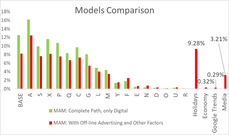 The chart above presents a comparison of the MAM run on only digital data vs scenario when in addition where added data on holidays, economy, Google trends, and off-line media activity[5].