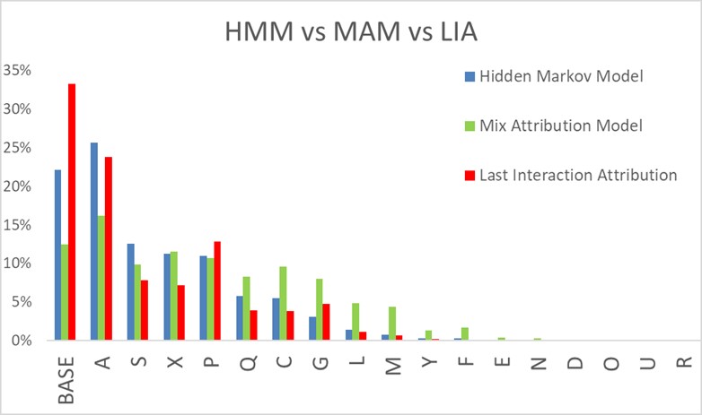 In our business experience, we are used to working with Hidden Markov Model (HMM) and Last Interaction Attribution (LIA)[3]. Our expectation is the MAM should produce results close to current industry applied models.